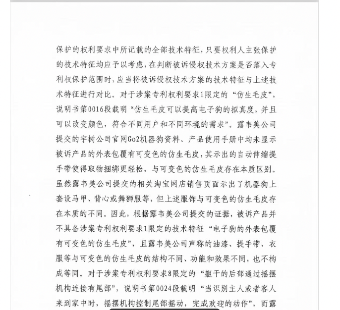 从判决书内容来看,法院对被控侵权产品与涉案专利中的技术特征进行比对,多项评述认为宇树科技产品不具有涉案专利要求限定的技术特征。尤其是,涉案专利权利要求1限定的“仿生毛皮”“液位传感器”“气体传感器”等,法院认定,宇树科技产品不构成等同。