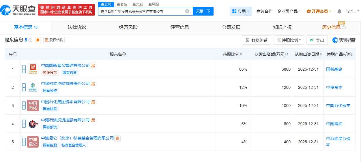 天眼查APP显示,近日,央企战新产业发展私募基金管理有限公司成立,注册资本1亿元,经营范围包含:私募股权投资基金管理、创业投资基金管理服务。天眼查股权穿透显示,该公司由中国国新控股有限责任公司全资子公司中国国新基金管理有限公司、中国移动通信集团有限公司全资子公司中移资本控股有限责任公司、中国石化集团资本有限公司等共同持股。