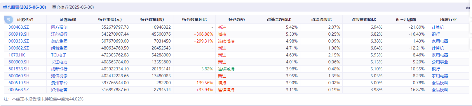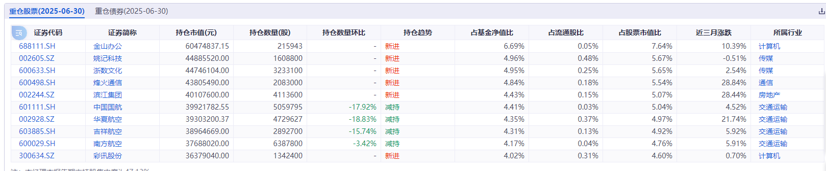 今年一季度何奇以扩大内需为重要配置主线,重仓了蒙牛乳业(02319.HK)、海底捞(06862.HK)、泸州老窖(000568.SZ)、九毛九(09922.HK)等个股,同时重仓了多只航空板块的个股;到了二季度,何奇维持了对航空板块的配置,同时“抛弃”前述消费股,转而投向地产、传媒等行业,新进了滨江集团(002244.SZ)、保利发展(600048.SH)、金山办公(688111.SH)、姚记科技(002605.SZ)、浙数文化(600633.SH)等个股,可谓与热点“完美”擦肩而过。