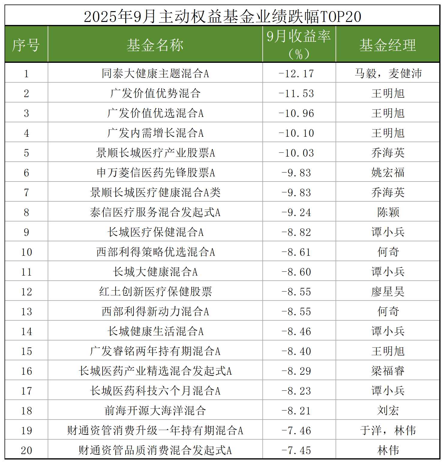 二季度大热的创新药板块三季度风光不再,多只重仓该板块的个股三季度业绩垫底,其中上半年夺得“季军”的长城医药产业精选9月收益率仅-8.29%,在主动权益基金中排名靠后。