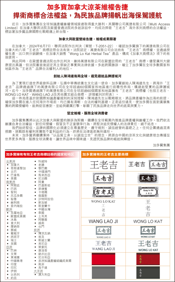 加多宝引用《香港经济日报》的报道称,创始人陈鸿道通过万捷有限公司,在包括加拿大、美国、泰国、新加坡等在内的全球超60个国家/地区,布局了“王老吉”商标(含王老吉WONG LO KAT、WANG LAO JI及其他图文组合商标)。