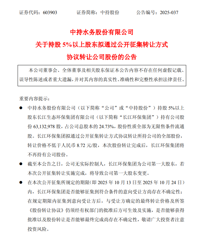 10月12日,中持股份(603903.SH)公告称,公司持股5%以上股东长江生态环保集团有限公司拟通过公开征集转让方式协议转让所持公司的全部股份63,132,978股,占公司总股本的24.73%,转让价格不低于8.72元/股。本次股份转让完成后,长江环保集团将不再持有公司股份。