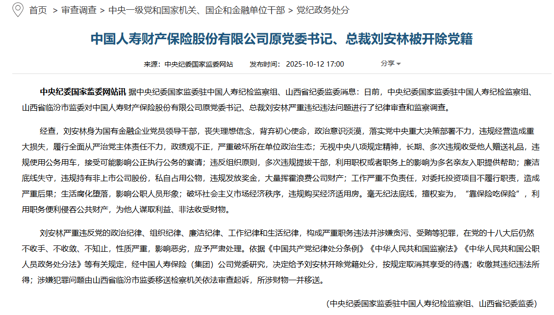 中国人寿财产保险股份有限公司原党委书记、总裁刘安林被开除党籍