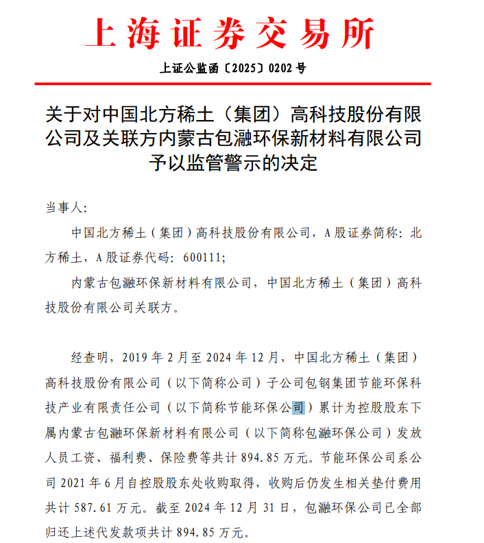 近日,上交所发布关于对中国北方稀土(集团)高科技股份有限公司及关联方内蒙古包瀜环保新材料有限公司予以监管警示的决定。