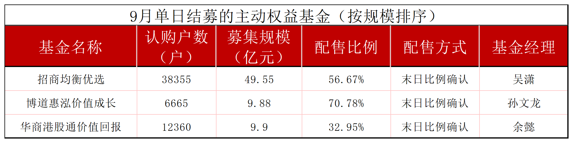 此外,9月还有博道惠泓价值成长、华商港股通价值回报2只产品实现一日售罄并最终按比例配售。
