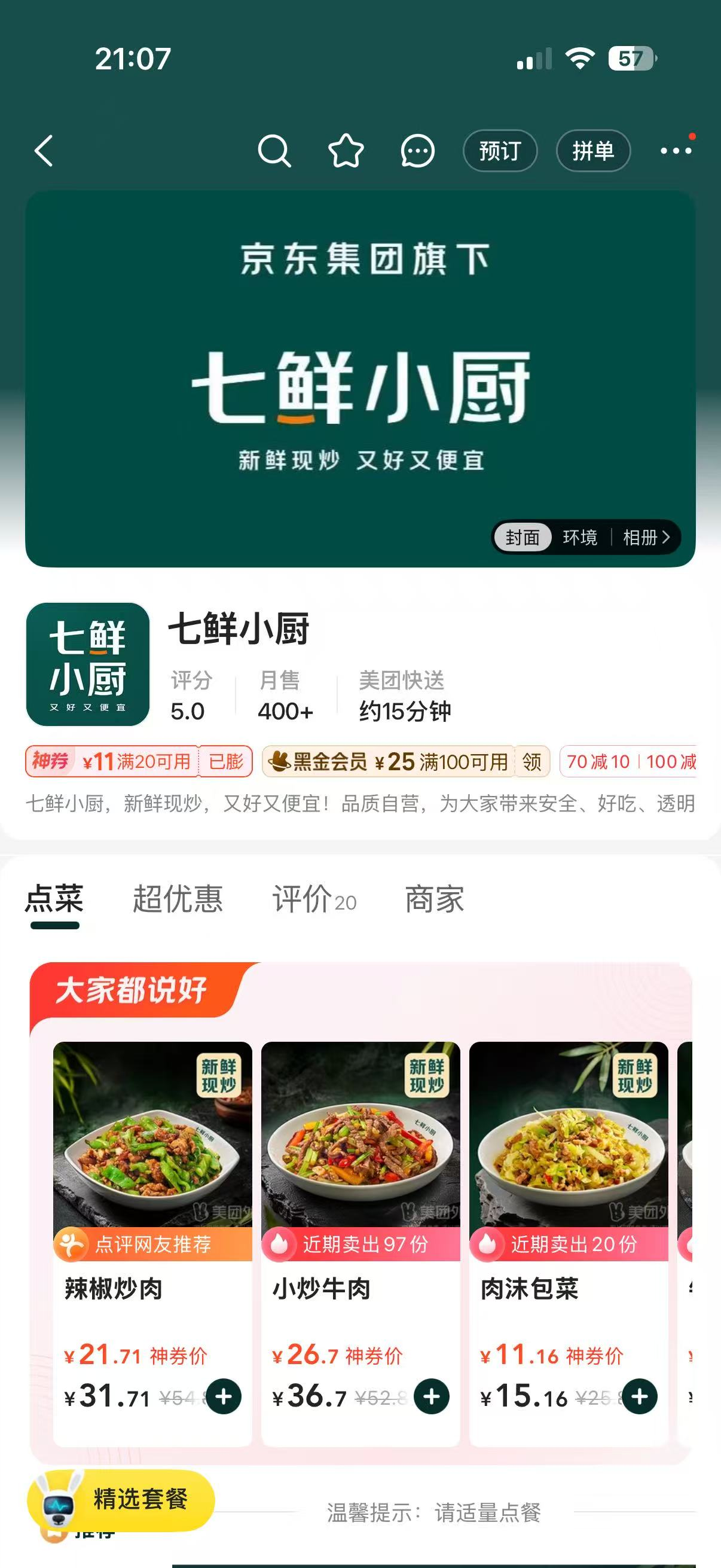 财闻注意到,10月13日,京东自营外卖品牌“七鲜小厨”登陆美团APP,推出免配送费服务并支持平台红包优惠。此前,该品牌已完成在淘宝闪购的上线部署。