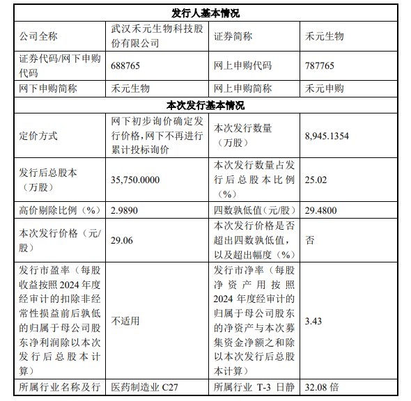 禾元生物今日申购,发行价29.06元/股