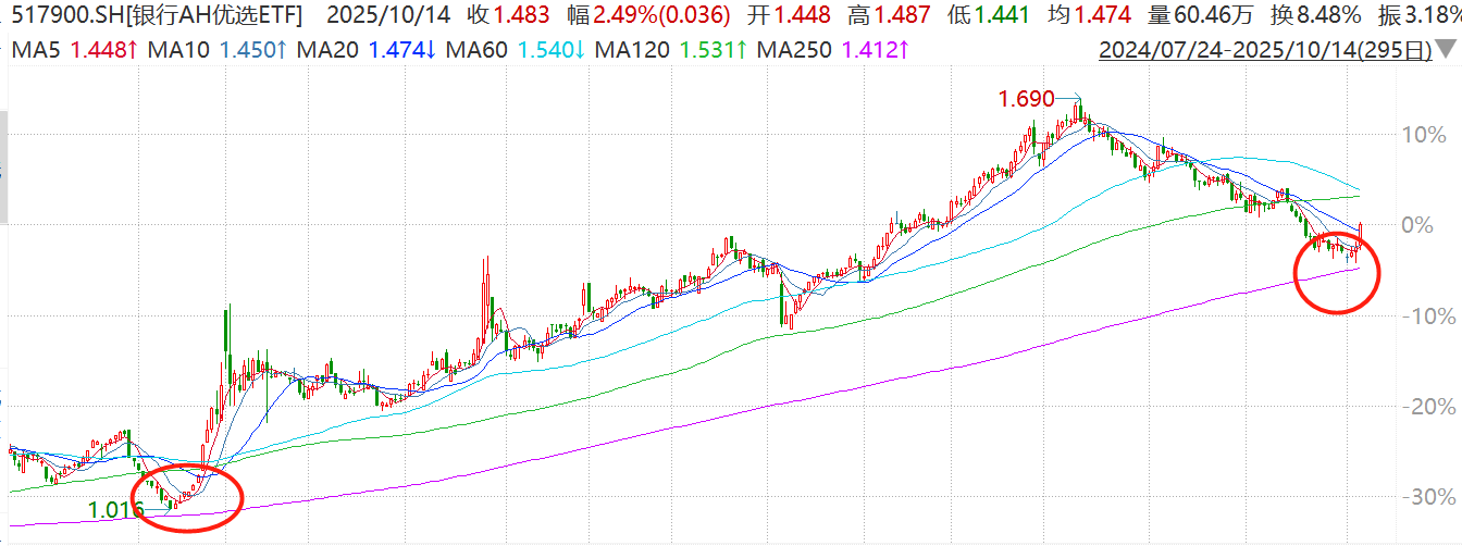 从历史走势来看,银行AH优选ETF(517900)此前连续回调,时隔一年多时间再次回落至年线附近。