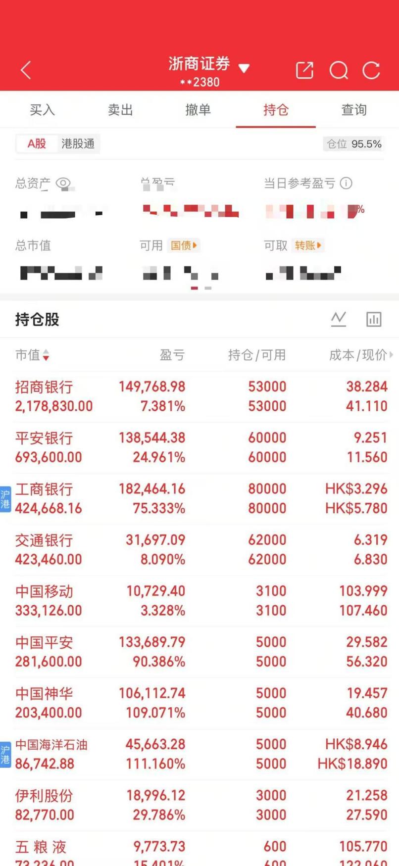 喜欢“主动买套”的“厦门火枪”,目前的个股持仓大多是如今的新股民都瞧不上的“老登股”,包括招商银行、平安银行、工商银行、交通银行、中国移动、中国平安、伊利股份等。因为都是低位买入,截至10月14日上午,“厦门火枪”的持仓全红。