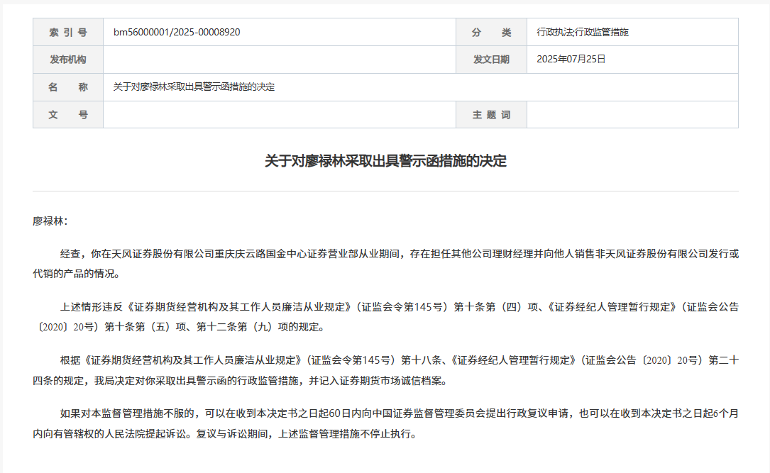 重庆证监局7月25日披露的文件显示,天风证券重庆庆云路国金中心证券营业部的员工廖禄林,在从业期间存在担任其他公司理财经理并向他人销售非天风证券股份有限公司发行或代销的产品的情况。最终,该营业部和从业人员均被采取出具警示函的行政监管措施,并记入证券期货市场诚信档案。