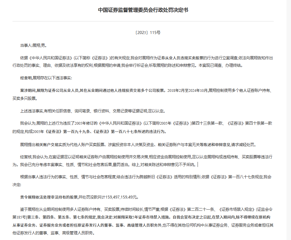 今年唯一一张亿元“大单”就在此列。证监局披露的今年第115号行政处罚决定书显示,展翔作为从业人员,在2018年2月至2024年10月期间,控制使用多个他人证券账户持有、买卖多只股票。虽然展翔提出相关账户交易实质为代他人账户买卖股票、涉案投资非本人决策及资金、相关证券账户与本案无关等陈述和申辩意见,但证监会并没有采纳其申辩意见,最终决定责令展翔依法处理非法持有的股票,并处罚没款共计1.59亿元。