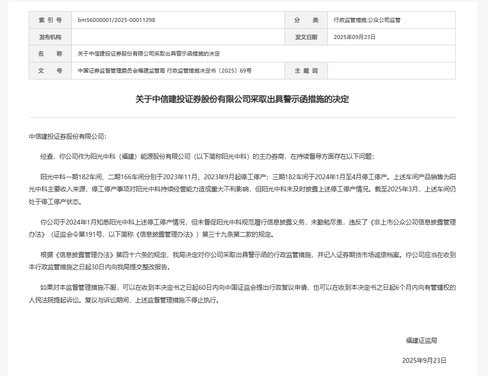 福建证监局披露的罚单显示,阳光中科在2023年、2024年分别有三个车间停工停产,且这三个车间产品销售为其主要收入来源,停工停产会对阳光中科持续经营能力造成重大不利影响,但是阳光中科未及时披露该信息,作为主办券商的中信建投在2024年1月知悉前述情况后,也没有督促阳光中科规范履行信息披露义务。