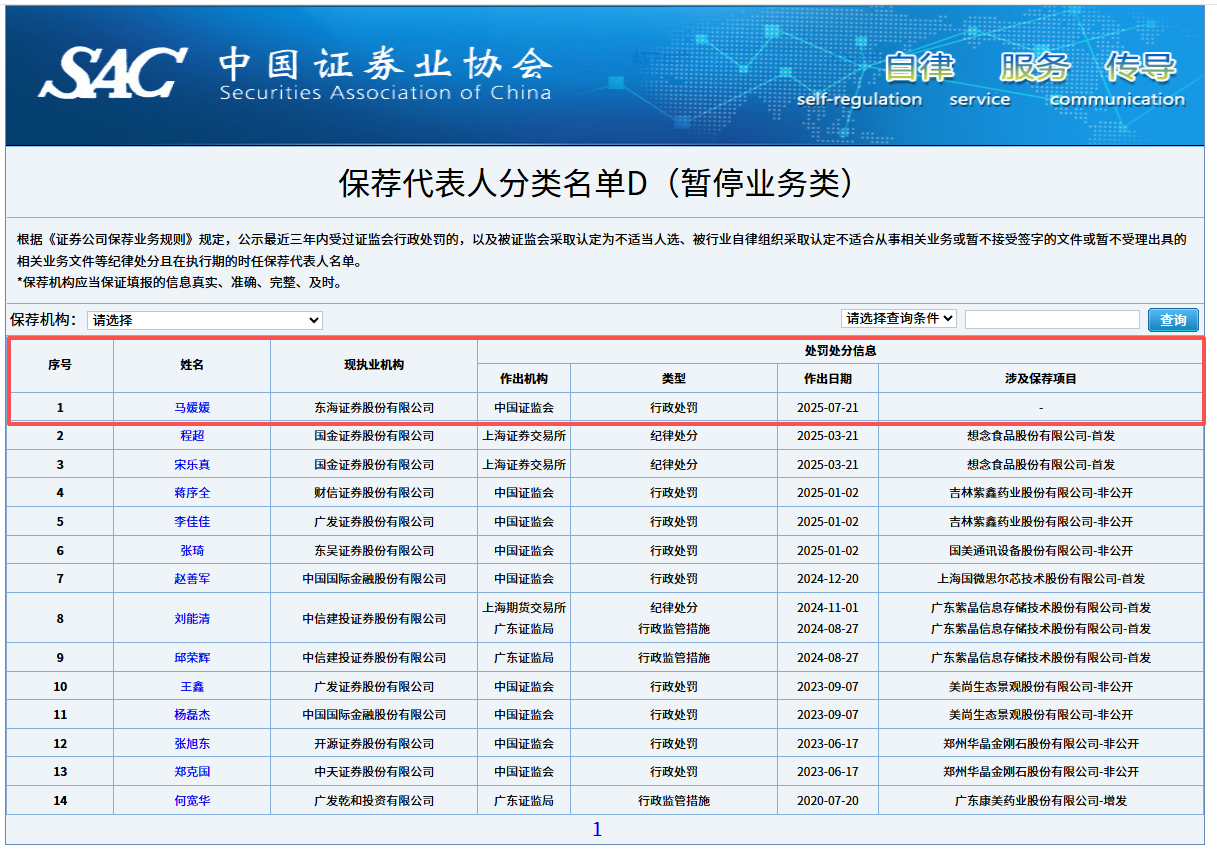 中国证券业协会官网显示,马媛媛目前已经被列入保荐代表人D类(暂停业务类)名单中。