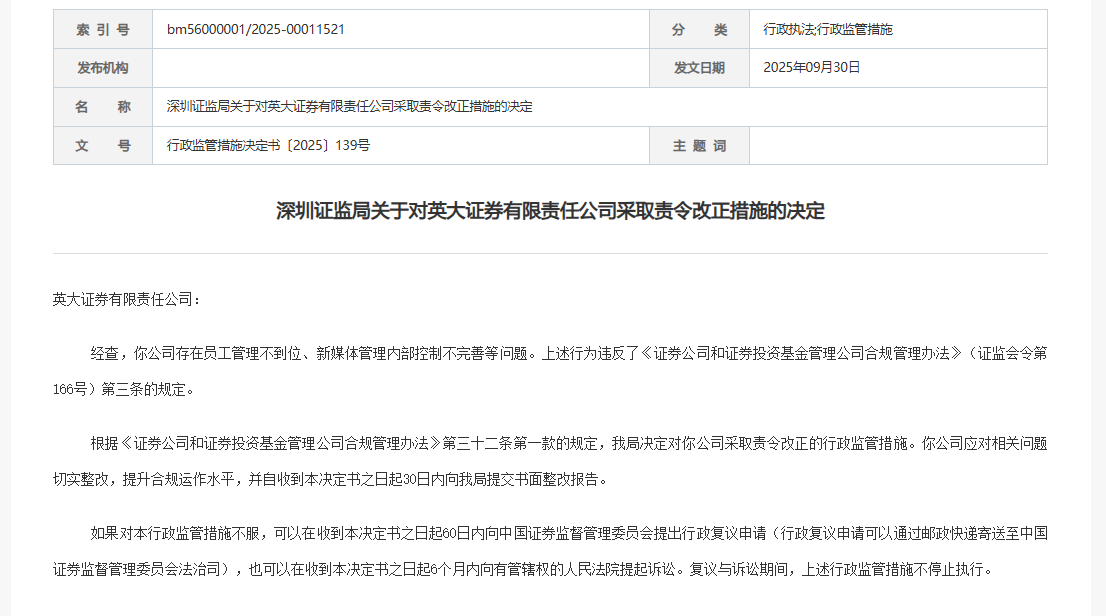 深圳证监局披露的两张罚单显示,因为存在员工管理不到位、新媒体管理内部控制不完善等问题,英大证券和分管经纪业务的高级管理人员均被处罚。