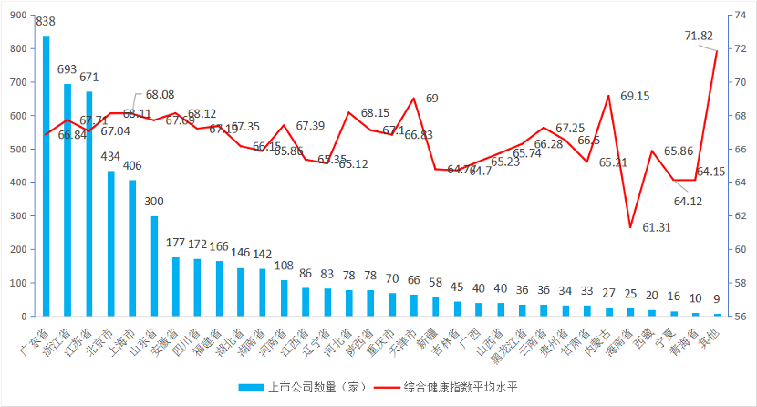 从综合健康指数平均水平看,在上市公司数量超过100家的省份(自治区、直辖市)中,综合健康指数平均水平最高的是安徽省(68.12)、北京市(68.11)、上海市(68.08)、浙江省(67.71)、山东省(67.69)。