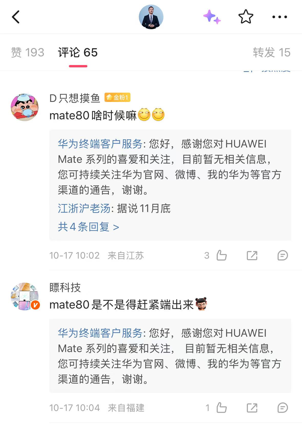 有网友在其微博下评论Mate 80何时发布,官方客服回应道:您好,感谢您对 HUAWEI Mate 系列的喜爱和关注,目前暂无相关信息,您可持续关注华为官网、微博、我的华为等官方渠道的通告,谢谢。