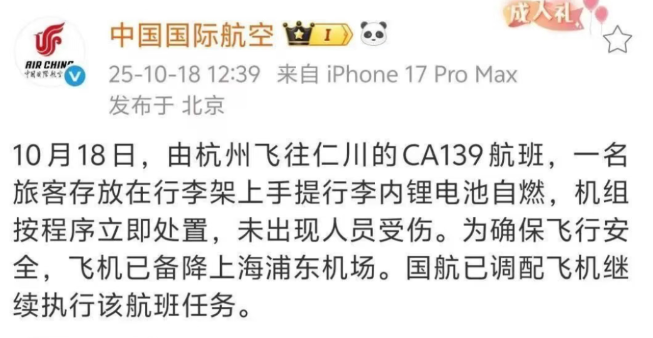 10月18日,中国国际航空发布情况通报:10月18日,由杭州飞往仁川的CA139航班,一名旅客存放在行李架上手提行李内锂电池自燃,机组按程序立即处置,未出现人员受伤。为确保飞行安全,飞机已备降上海浦东机场。国航已调配飞机继续执行该航班任务。