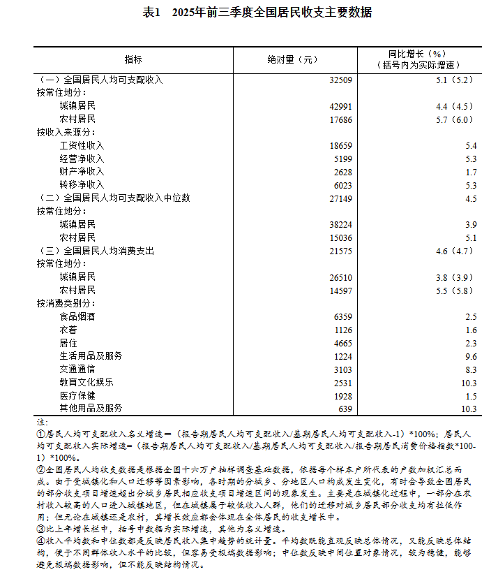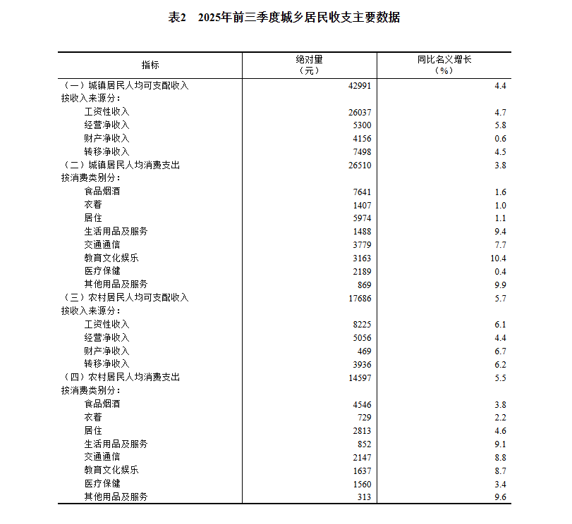 10月20日,国家统计局发布2025年前三季度居民收入和消费支出情况。
