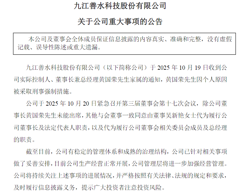 10月20日盘后,善水科技(301190.SZ)公告称,于10月19日收到公司实际控制人、董事长兼总经理黄国荣家属的通知,黄国荣因个人原因被采取刑事强制措施。