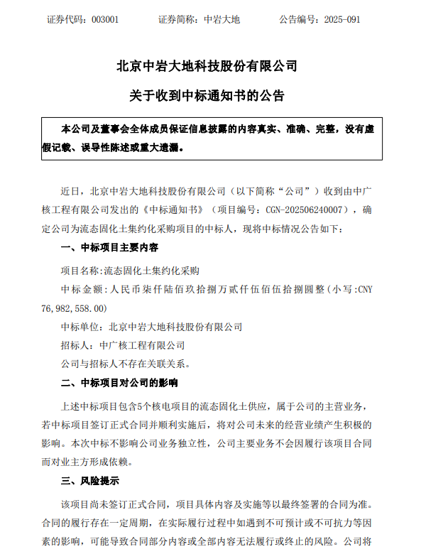10月21日,中岩大地(003001.SZ)早间公告,近日,公司收到由中广核工程有限公司发出的《中标通知书》,确定公司为流态固化土集约化采购项目的中标人,中标金额7698.26万元。上述中标项目包含5个核电项目的流态固化土供应,属于公司的主营业务,若中标项目签订正式合同并顺利实施后,将对公司未来的经营业绩产生积极的影响。