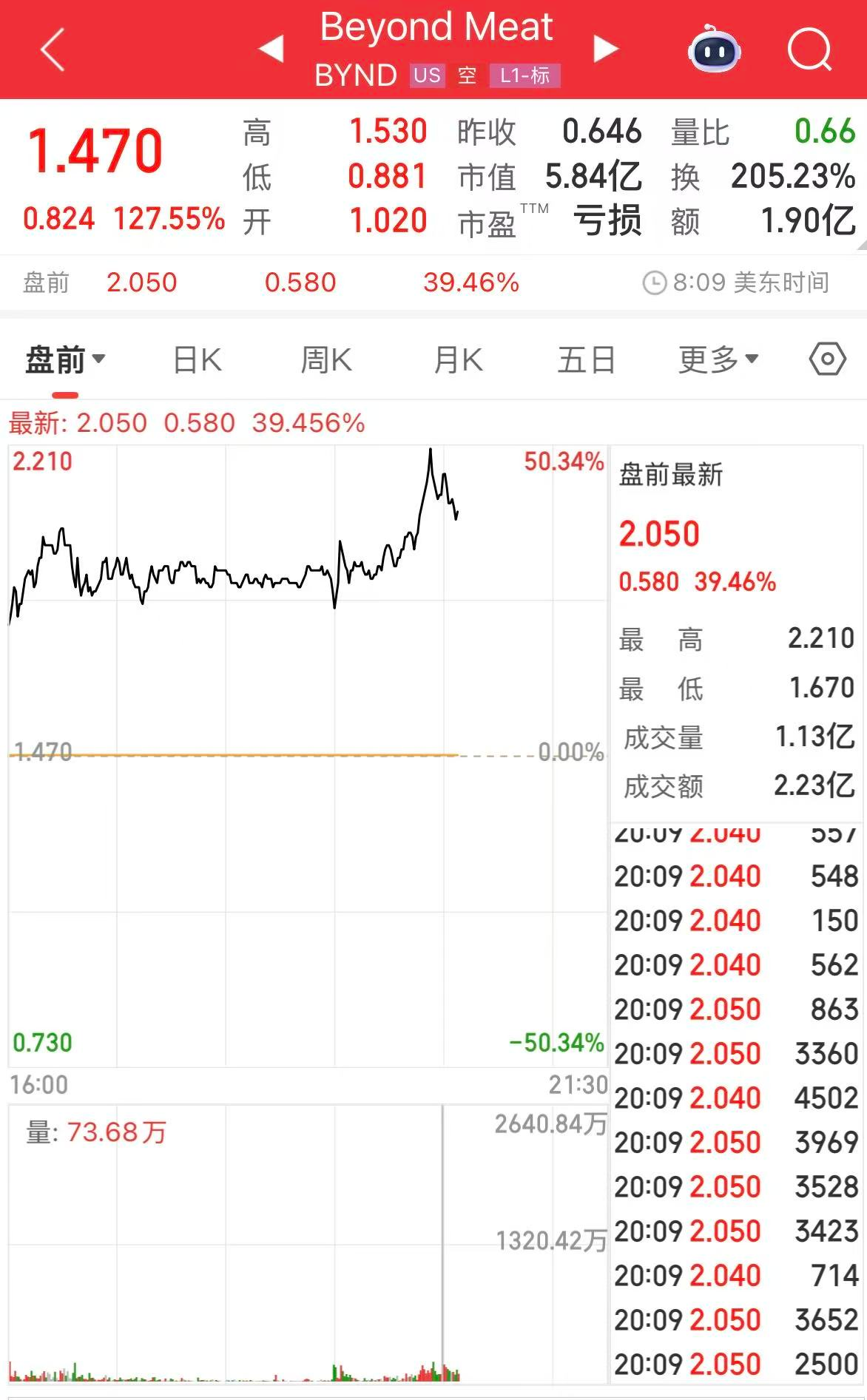 10月21日,“人造肉第一股”Beyond Meat(BYND)美股盘前大涨40%,该公司上个交易日收涨127.55%。