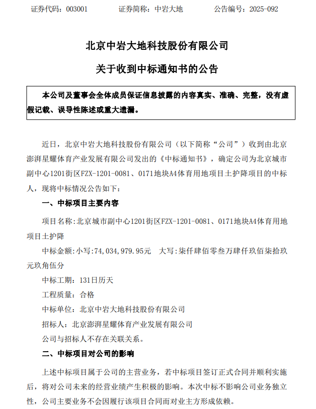 10月22日,中岩大地(003001.SZ)公告称,公司收到由北京澎湃星耀体育产业发展有限公司发出的《中标通知书》,确定公司为北京城市副中心1201街区FZX-1201-0081、0171地块A4体育用地项目土护降项目的中标人,中标金额为7403.5万元。该项目属于公司主营业务,若中标项目签订正式合同并顺利实施,将对公司未来的经营业绩产生积极影响。