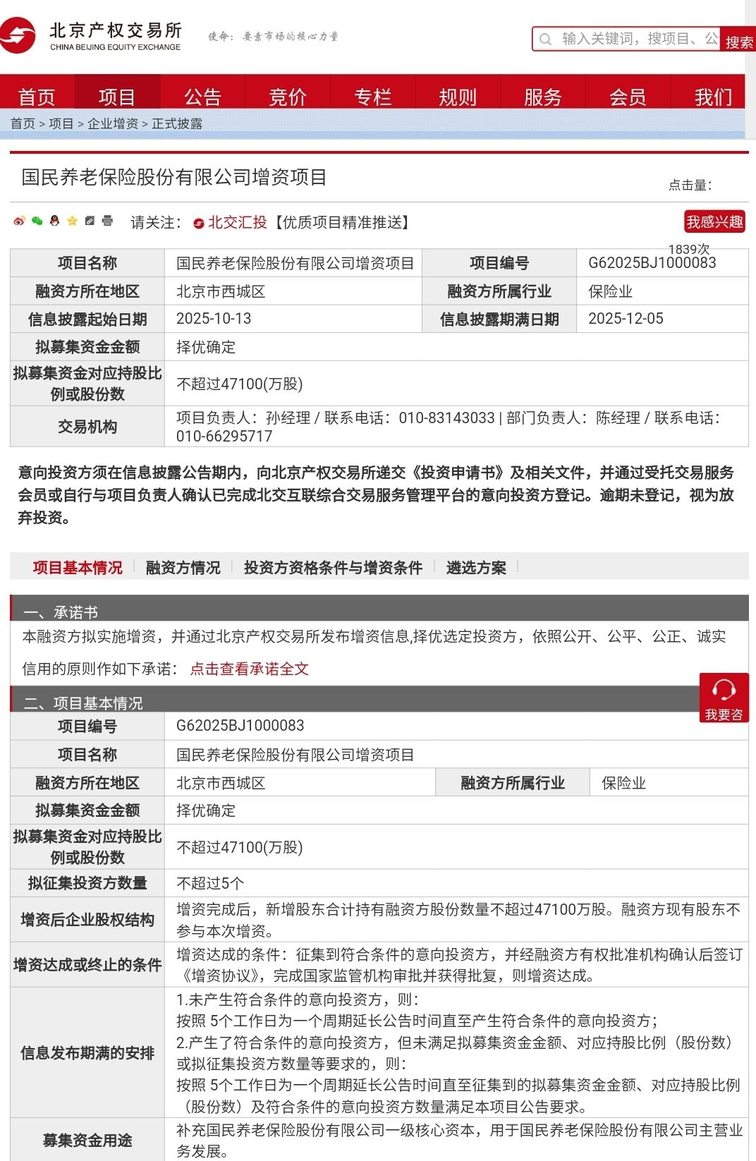 10月13日,北京产权交易所官网披露了国民养老的增资项目,此次募集资金对应持股比例或股份数不超过4.71亿股,拟征集投资方数量不超过5个,现有股东不参与本次增资。项目信息显示,募集资金是为补充一级核心资本,用于主营业务发展。项目信息披露期为2025年10月13日至2025年12月5日。