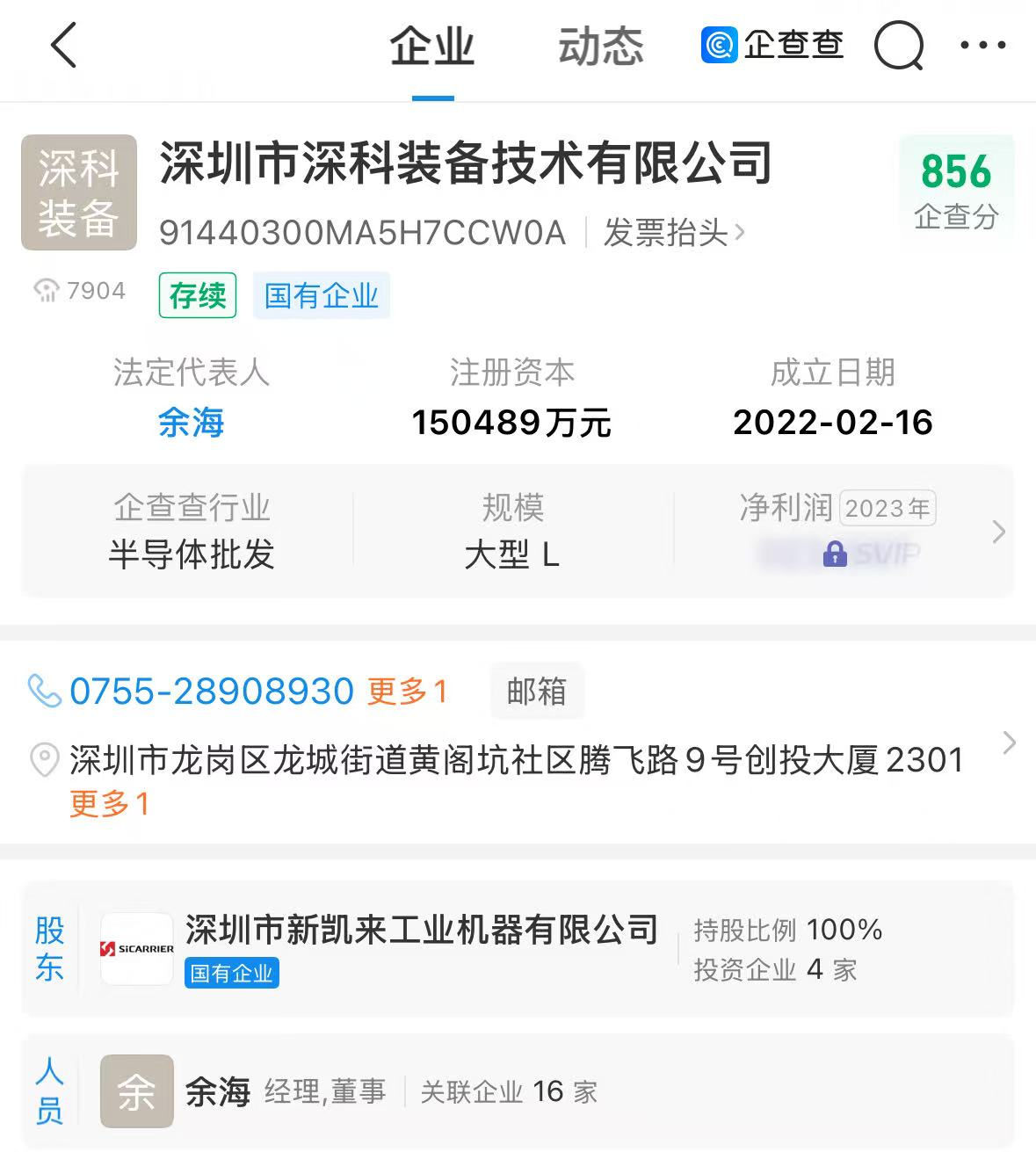 深圳市深科装备技术有限公司成立于2022年2月,注册资本约15亿元,经营范围包括智能基础制造装备销售、半导体器件专用设备销售、电子专用设备销售等。股权全景穿透图显示,该公司由新凯来旗下深圳市新凯来工业机器有限公司全资持股。