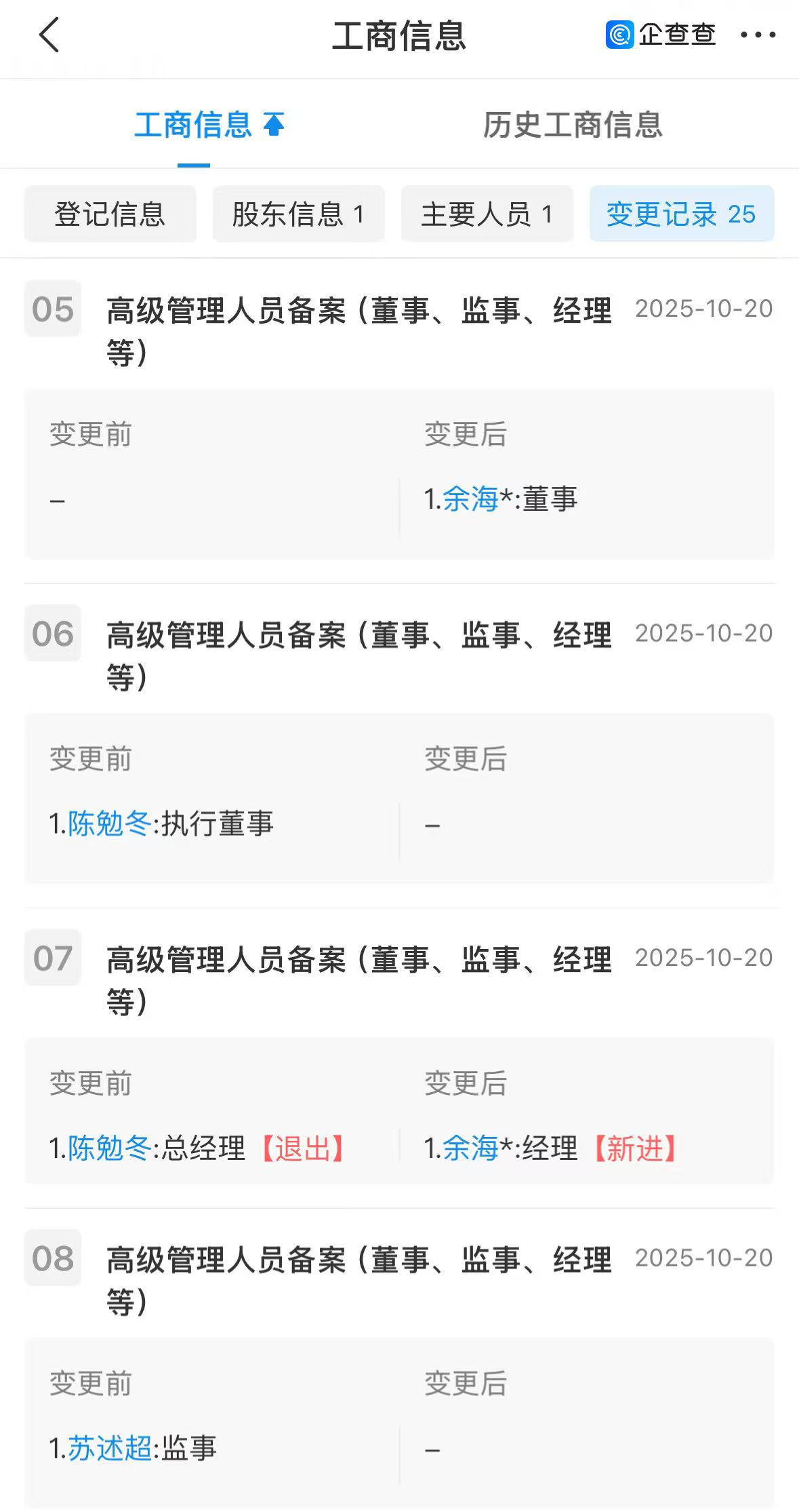 近日,深圳市深科装备技术有限公司发生工商变更,陈勉冬卸任法定代表人、执行董事、总经理,由余海接任法定代表人,并担任董事、经理。