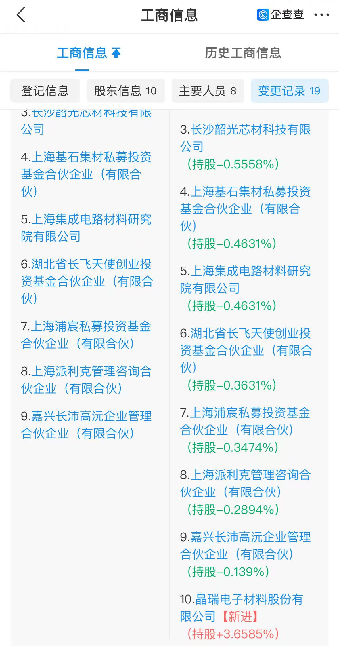 企查查app显示,近日,上海高光微半导体科技有限公司发生工商变更,注册资本增加至1312万元,新增股东晶瑞电材(300655.SZ),持股比例约为3.65%。
