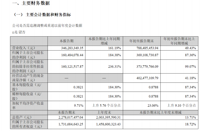 第三季度净利润1.6亿元,同比增长184.38%;前三季度净利润3.7亿元,同比增长87.36%。净利变动主要系本期黄金市场价格上涨所致。