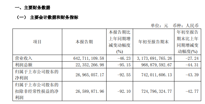 公司第三季度营收为6.43亿元,下降46.23%;净利润为2696.51万元,下降92.55%。前三季度营收为31.74亿元,下降27.24%;净利润为7.42亿元,下降43.39%。