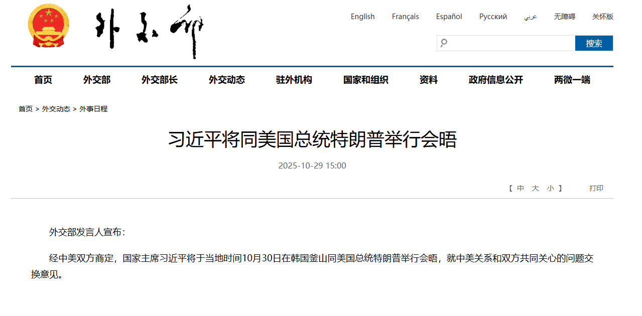 外交部发言人宣布:经中美双方商定,国家主席习近平将于当地时间10月30日在韩国釜山同美国总统特朗普举行会晤,就中美关系和双方共同关心的问题交换意见。
