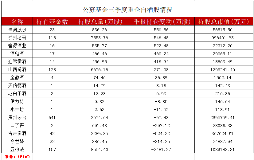 从公募基金三季报的重仓情况来看,洋河股份、泸州老窖、舍得酒业等9只白酒股获得增持;而五粮液、今世缘、古井贡酒等7只白酒股被减持;顺鑫农业、金种子酒、皇台酒业、*ST岩石等4只白酒股则未出现在公募基金重仓股名单中。