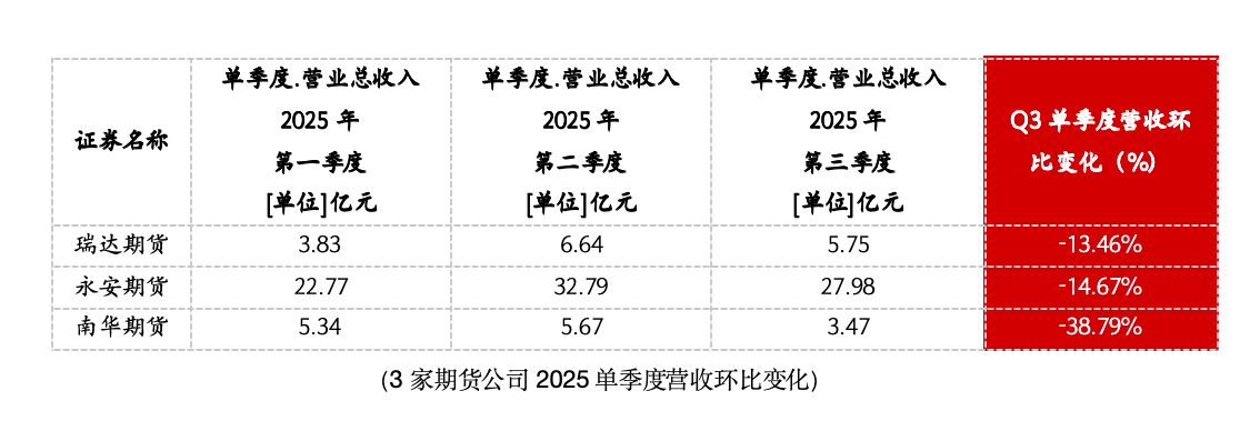 单季度维度下,几家期货公司营收也呈现环比下降态势。瑞达期货Q3单季度营收环比下降13.46%,降幅低于南华期货(38.79%)、永安期货(14.67%),展现出较强的抗风险能力。