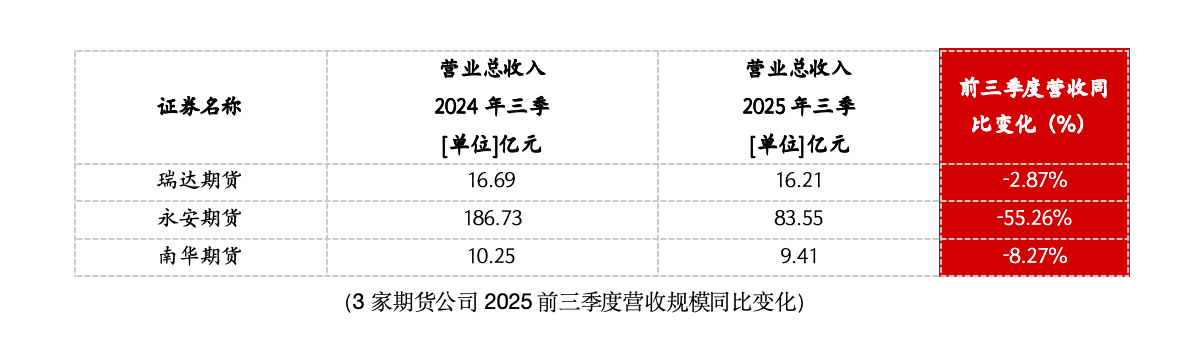 今年1-9月份,瑞达期货、永安期货、南华期货的营业收入分别为16.21亿元、83.55亿元、9.41亿元,同比均明显下滑,降幅分别为2.87%、55.26%、8.27%。