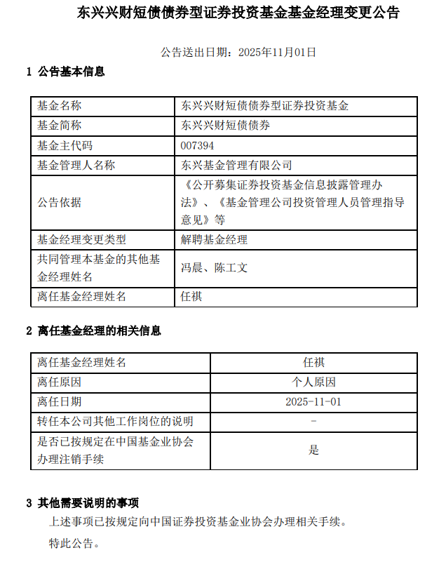 东兴兴财短债债券基金经理变更:任祺离任 冯晨、陈工文继续共同管理
