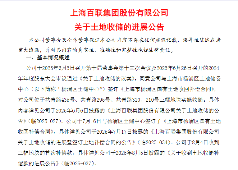 公告显示,百联股份于2025年6月5日召开第十届董事会第十三次会议及2025年6月26日召开的2024年年度股东大会审议通过《关于土地收储的议案》,同意公司与上海市杨浦区土地储备中心(以下简称“杨浦区土储中心”)签订《上海市杨浦区国有土地收回补偿合同》,对公司位于共青路435号、共青路295号、共青路310、210号三幅地块实施收储。