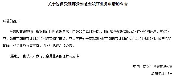 11月3日,工商银行发布公告,受宏观政策影响,根据我行风险管理要求,自2025年11月3日起,我行暂停受理如意金积存业务的开户、主动积存、新增定期积存计划以及提取实物的申请,存量客户处于有效期内的定期积存计划的执行以及办理赎回、销户不受影响。相关业务恢复事宜,请关注我行后续公告。