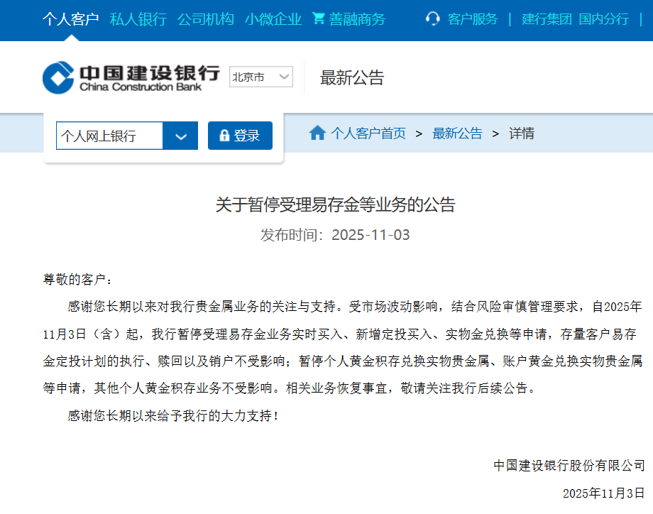 11月3日,建设银行(601939.SH)官网发布关于暂停受理易存金等业务的公告,受市场波动影响,结合风险审慎管理要求,自2025年11月3日(含)起,暂停受理易存金业务实时买入、新增定投买入、实物金兑换等申请,存量客户易存金定投计划的执行、赎回以及销户不受影响;暂停个人黄金积存兑换实物贵金属、账户黄金兑换实物贵金属等申请,其他个人黄金积存业务不受影响。相关业务恢复事宜,敬请关注后续公告。