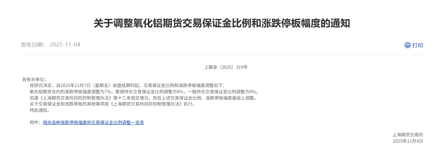 11月4日,上期所发布通知,自2025年11月7日(星期五)收盘结算时起,交易保证金比例和涨跌停板幅度调整如下:氧化铝期货合约的涨跌停板幅度调整为7%,套保持仓交易保证金比例调整为8%,一般持仓交易保证金比例调整为9%。如遇《上海期货交易所风险控制管理办法》第十三条规定情况,则在上述交易保证金比例、涨跌停板幅度基础上调整。