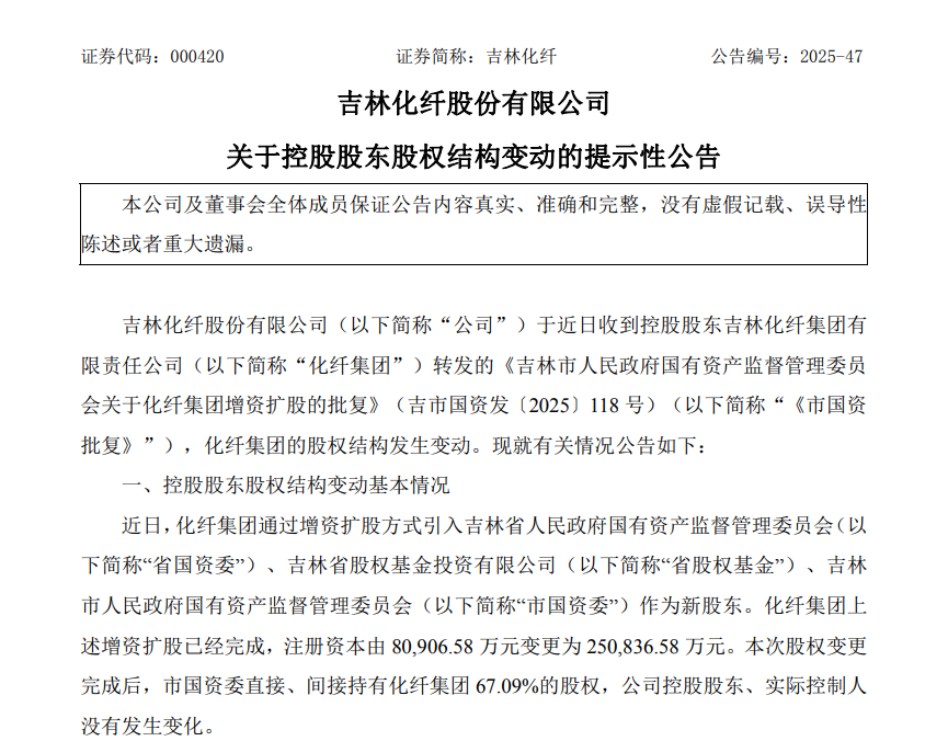 11月4日,吉林化纤(000420.SZ)公告称,近日,公司控股股东吉林化纤集团有限责任公司通过增资扩股方式引入吉林省人民政府国有资产监督管理委员会、吉林省股权基金投资有限公司、吉林市人民政府国有资产监督管理委员会作为新股东,注册资本由8.09亿元增至25.08亿元。本次股权变更完成后,市国资委直接、间接持有化纤集团67.09%的股权,公司控股股东、实际控制人未发生变化。