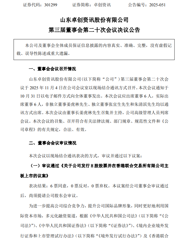 11月4日,卓创资讯(301299.SZ)公告称,公司第三届董事会第二十次会议审议通过《关于公司发行H股股票并在香港联合交易所有限公司主板上市的议案》。董事会同意公司在境外发行股份(H股)并在香港联交所主板上市,以进一步提高公司综合竞争力,提升国际品牌形象,并利用国际资本市场,多元化融资渠道。该议案尚需提请公司股东会审议。