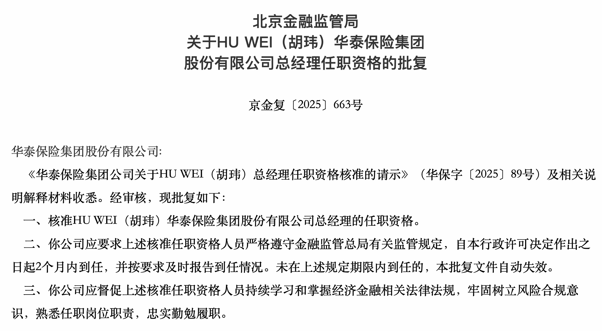近日,北京金融监管局发布关于HU WEI(胡玮)华泰保险集团股份有限公司总经理任职资格的批复显示,核准HU WEI(胡玮)华泰保险集团股份有限公司总经理的任职资格。