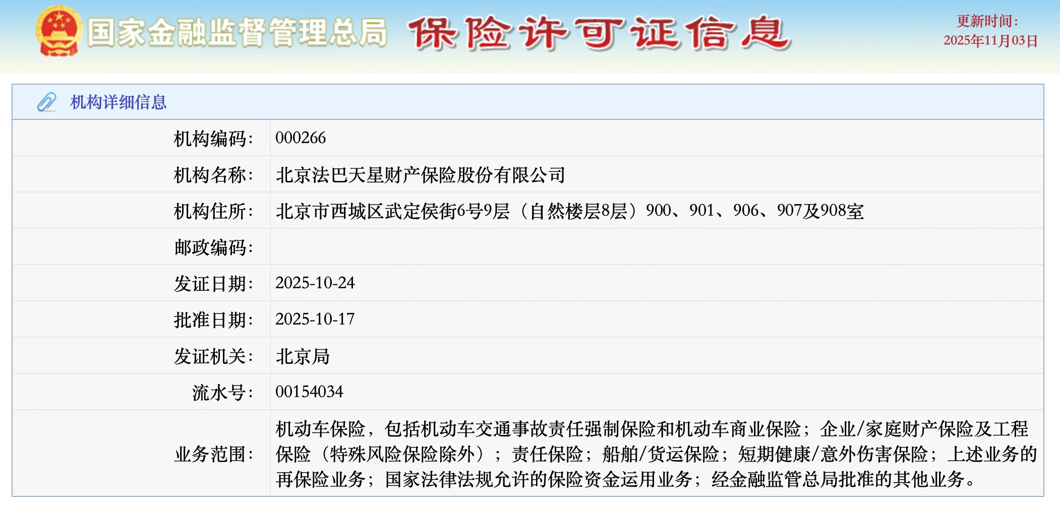 国家金融监督管理总局11月3日更新信息显示,北京法巴天星财产保险股份有限公司(以下简称“法巴天星财险”)已获北京金融监管局颁发的保险许可证。机构住所为北京市西城区武定侯街6号9层(自然楼层8层)900、901、906、907及908室。业务范围为机动车保险,包括机动车交通事故责任强制保险和机动车商业保险;企业/家庭财产保险及工程保险(特殊风险保险除外);责任保险;船舶/货运保险;短期健康/意外伤害保险;上述业务的再保险业务;国家法律法规允许的保险资金运用业务;经金融监管总局批准的其他业务。