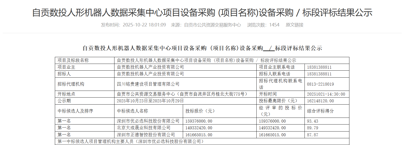 11月4日,据四川省公共资源交易信息网披露信息,优必选中标“自贡数投人形机器人数据采集中心项目设备采购”,中标产品为优必选最新款可自主换电的具身智能人形机器人Walker S2,采购金额达1.59亿元。该订单预计在11月完成交付。