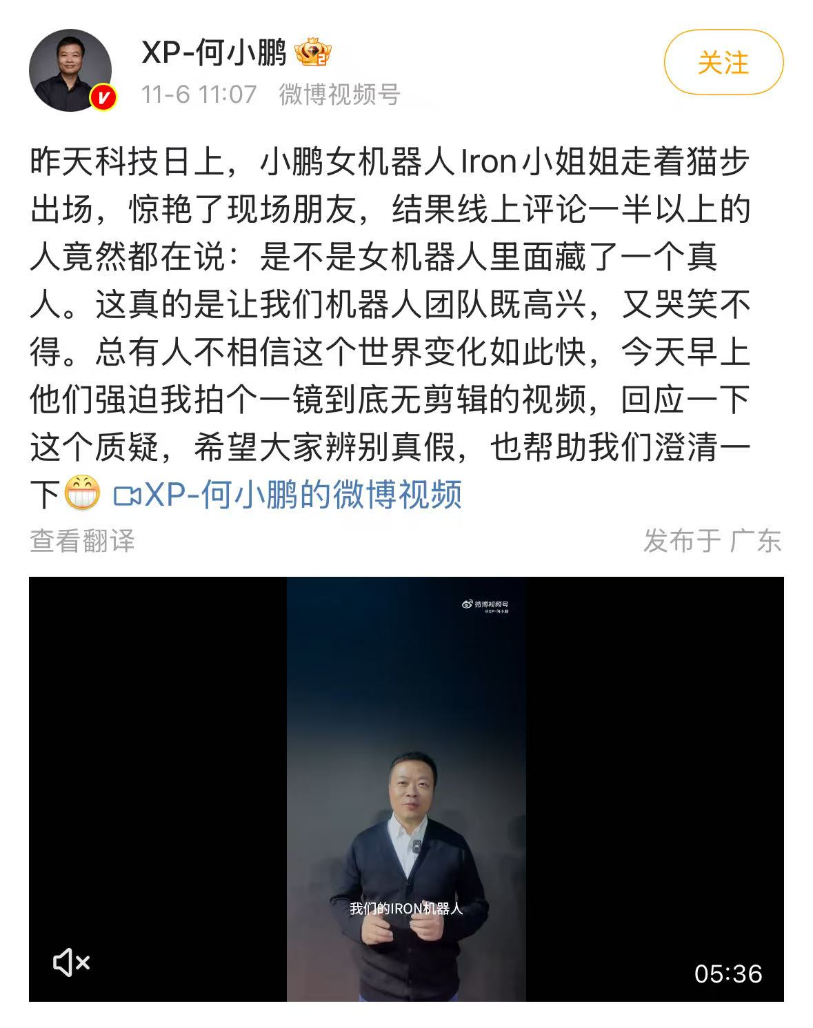 6日上午,何小鹏微博回应:昨天科技日上,小鹏女机器人Iron小姐姐走着猫步出场,惊艳了现场朋友,结果线上评论一半以上的人竟然都在说:是不是女机器人里面藏了一个真人。这真的是让我们机器人团队既高兴,又哭笑不得。总有人不相信这个世界变化如此快,今天早上他们强迫我拍个一镜到底无剪辑的视频,回应一下这个质疑,希望大家辨别真假,也帮助我们澄清一下。