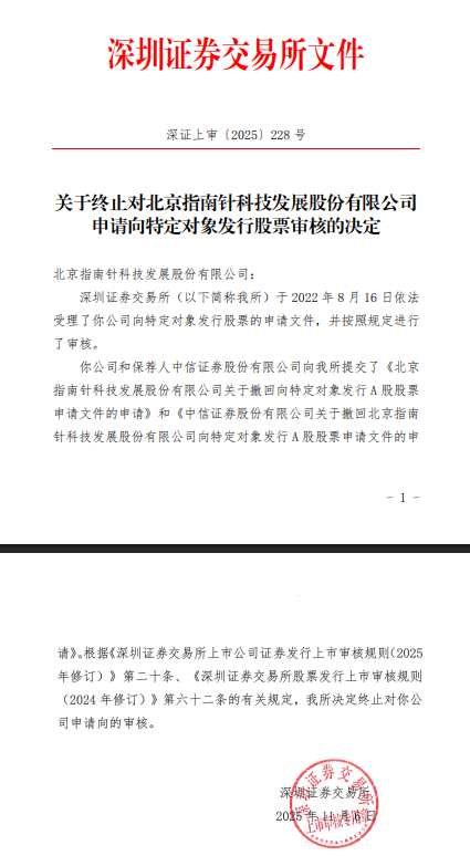 11月6日,深交所发布关于终止对指南针(300803.SZ)再融资审核的决定。深交所表示,指南针和保荐人中信证券股份有限公司向深交所提交了《北京指南针科技发展股份有限公司关于撤回向特定对象发行 A 股股票申请文件的申请》和《中信证券股份有限公司关于撤回北京指南针科技发展股份有限公司向特定对象发行 A 股股票申请文件的申请》。根据有关规定,终止对指南针申请向特定对象发行股票的审核。
