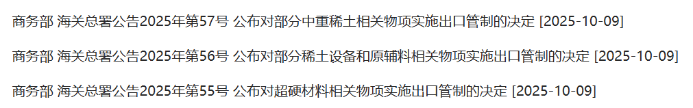 值得一提的是,第55号、56号、57号、58号公告是两部门发布的对涉及超硬材料、部分稀土设备和原辅料、锂电池和人造石墨负极材料、部分中重稀土等相关物项实施出口管制。根据原公告,第55号、56号、57号、58号公告原定于11月8日起实施。