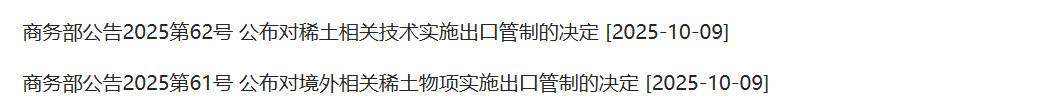 第61号、62号公告则是商务部发布的对境外相关稀土物项实施出口管制以及对稀土相关技术实施出口管制。根据原公告,第61号、62号公告则是公告发布日(10月9日)即实施。